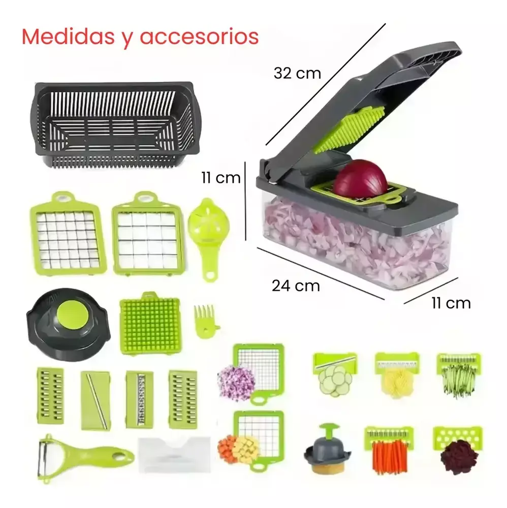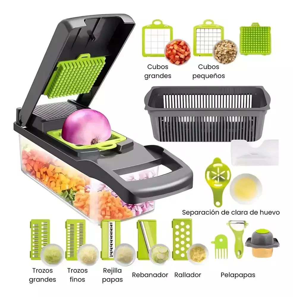 • 16 piezas en 1: incluye cuchillas intercambiables, contenedor grande, escurridor colador y más 🧩